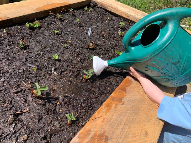 It has been hot and dry, so the seeds, the strawberries, and the asparagus all needed plenty of water. Look how much the strawberry plants have grown!
