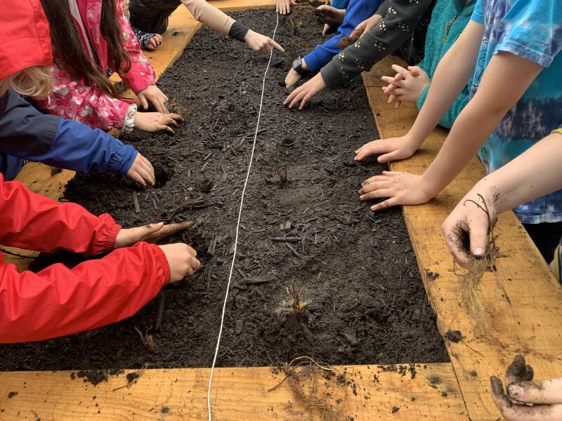 Lots of muddy hands helped with the planting. Thank you third grade!