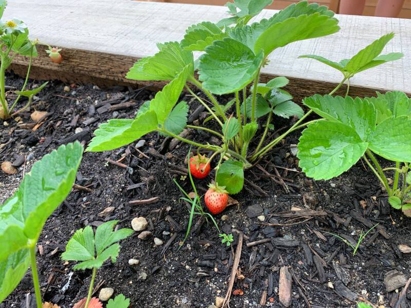 The strawberry plants are producing some sweet red fruit for hungry playground visitors.